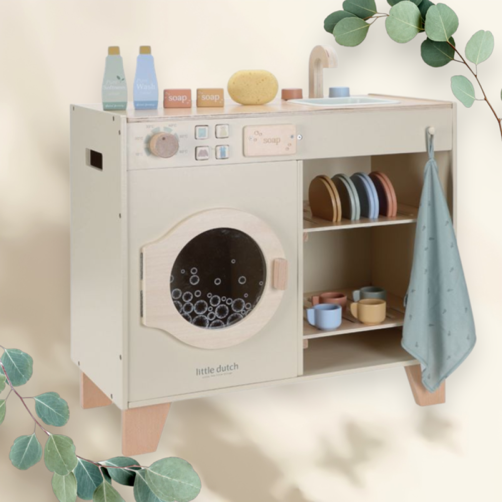 Deze houten wasmachine stimuleert creativiteit en rollenspel, waarbij je kindje zelf kan leren wassen!