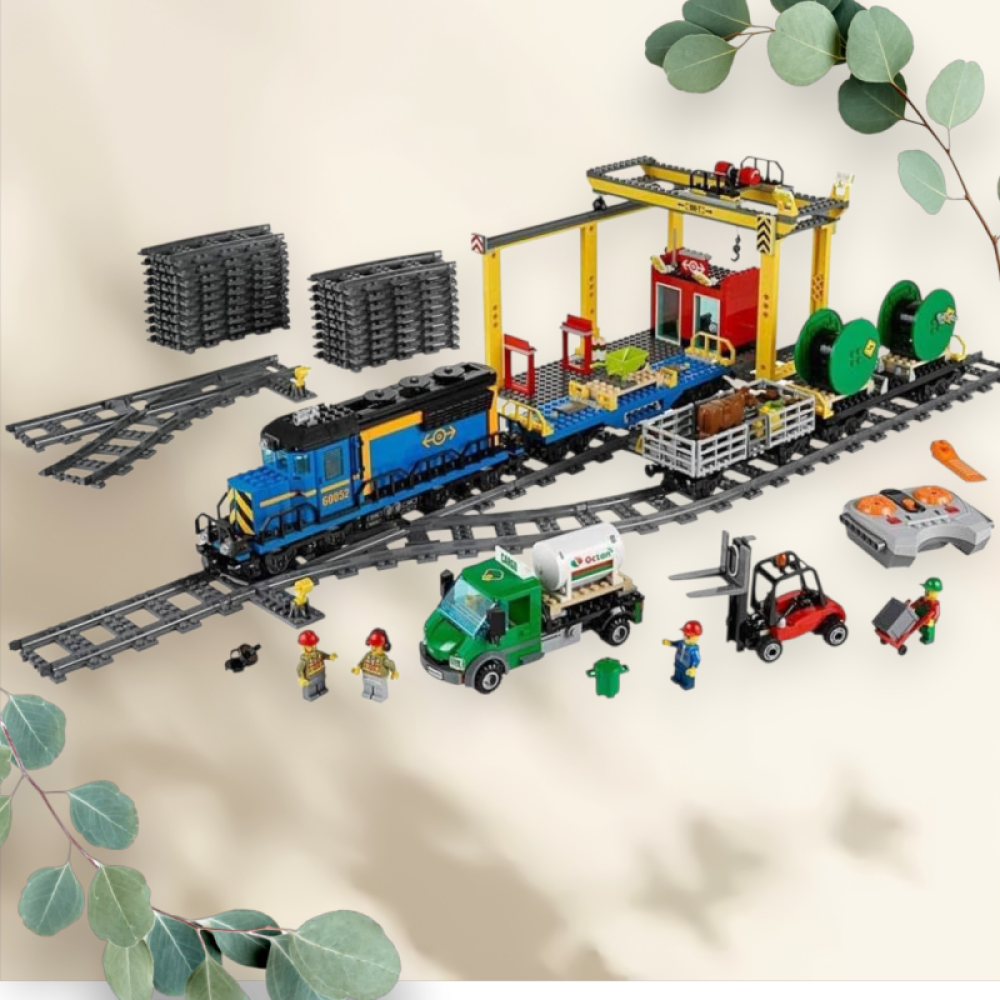 Huur de LEGO City Vrachttrein (set 60052) en word machinist van je eigen levendige stadslogistiek. Deze indrukwekkende gemotoriseerde trein, compleet met infrarood afstandsbediening met 7 snelheden, stelt je in staat om zware ladingen — van vee tot brandstoftanks — moeiteloos door LEGO City te transporteren