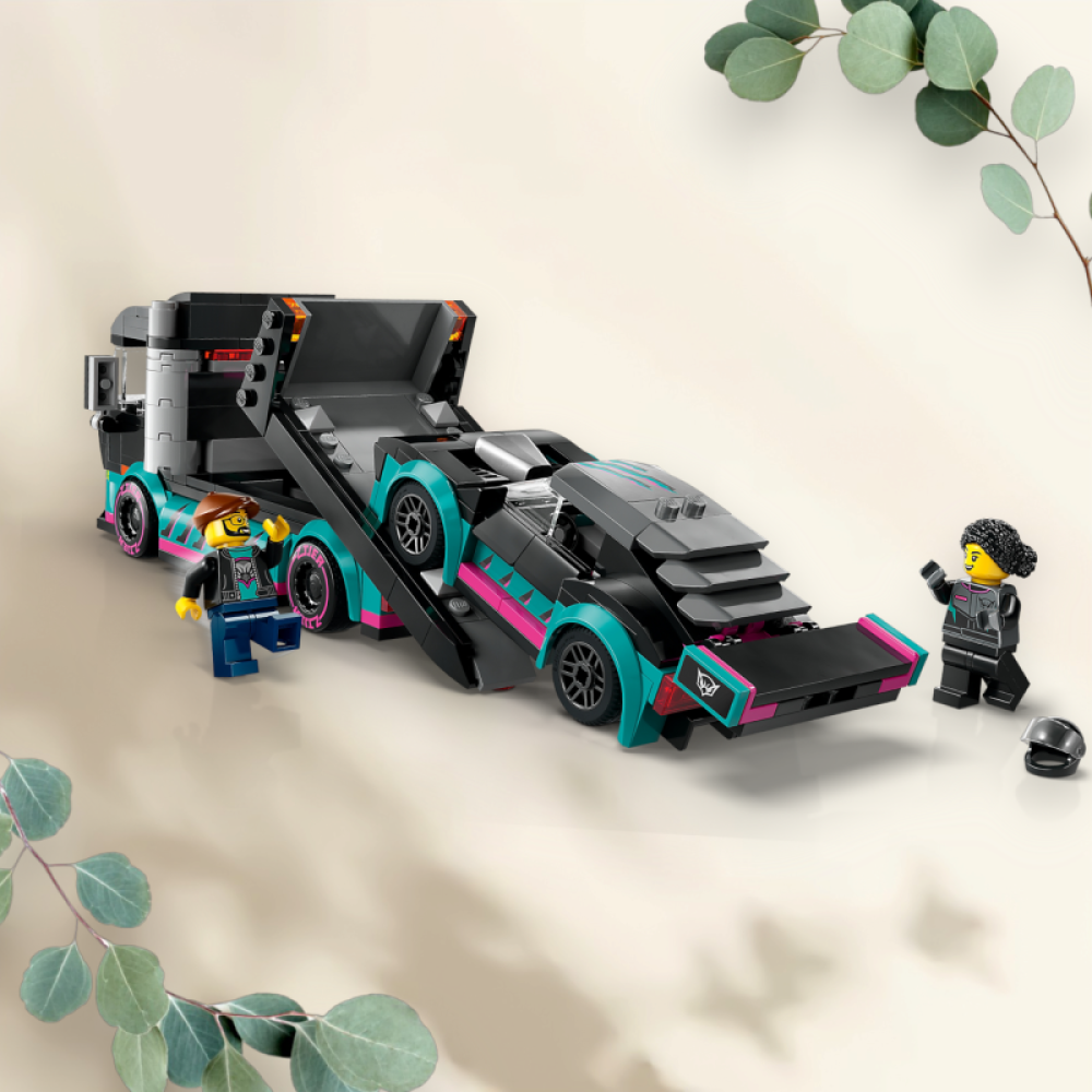 De set bestaat uit een robuuste transporttruck met een werkende laadbrug en een gestroomlijnde raceauto met verlaagde ophanging en brede velgen. Compleet met LEGO minifiguren van een racecoureur en vrachtwagenchauffeur, biedt deze set eindeloze mogelijkheden voor rollenspellen en fantasierijk speelplezier.