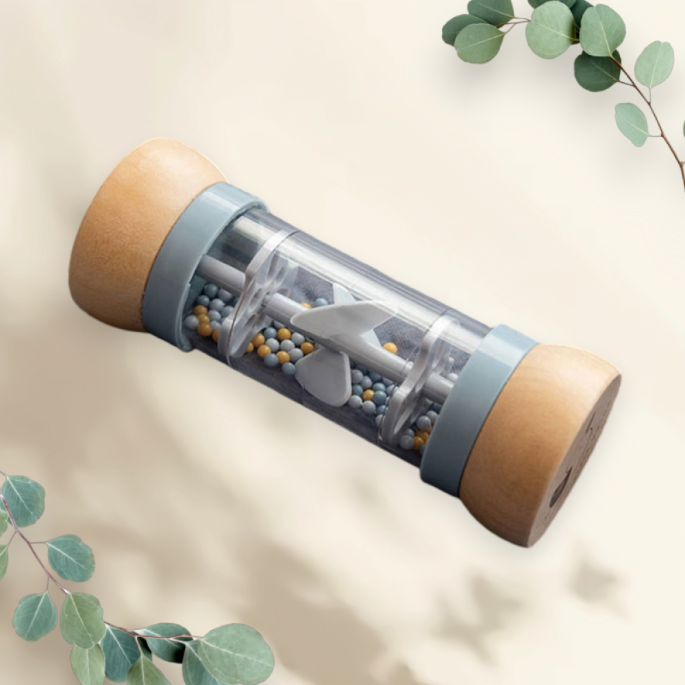 De regenrammelaar Sailors Bay is ideaal babyspeelgoed voor de allerkleinsten. Het ontwerp stimuleert zowel de zintuiglijke ontwikkeling als het muzikale talent van je baby. Door de rammelaar te schudden en om te draaien, worden de rustgevende geluiden van de kleine balletjes hoorbaar, alsof er zachte regendruppels vallen. De balletjes in drie verschillende kleuren vallen door kleine openingen en laten onderweg een propeller draaien, wat voor een aangename klank zorgt. Dankzij het formaat is de rammelaar perfect voor kleine handjes en gemakkelijk vast te houden. De houten boven- en onderkant zijn prachtig versierd met illustraties van een zeilboot en een zeemeeuw uit de Sailors Bay collectie, wat het speelgoed extra charmant maakt.