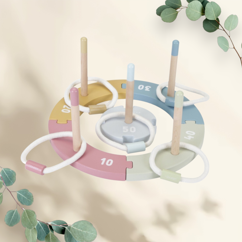 Dit superleuke ringwerpspel van Little Dutch vraagt om volledige concentratie. Focus, richt goed en gooi! Probeer de gevlochten ringen om de houten palen te krijgen en zoveel mogelijk punten te scoren. Je kunt het speelveld telkens anders opzetten, waardoor elk spel een nieuwe uitdaging is. Een gezellige activiteit voor het hele gezin.
