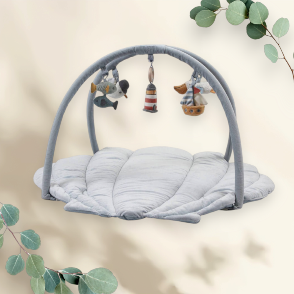 Ga op onderzoek uit met deze prachtige speelmat die je kleintje uitdaagt om te bewegen, reiken en grijpen! De speelmat, in de vorm van een zachte schelp, heeft een charmant haven-thema en is voorzien van 5 knuffeltjes die aan twee corduroy bogen hangen. Jouw kindje kan spelen met een meeuw, pelikaan, vuurtoren, zeilboot en vissen, die zorgen voor urenlang vermaak en ontdekkingsplezier. Een perfect speeltje om de zintuigen te prikkelen en beweging te stimuleren.